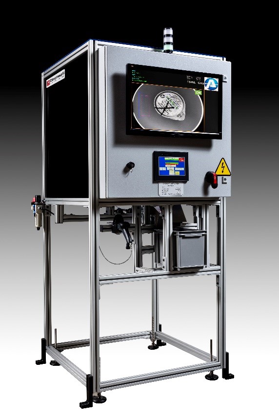 This automated inspection system was developed and programmed for inline inspections of human readable information on the tops of 2” diameter medicine cups.